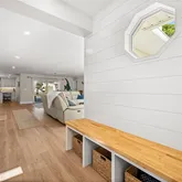 Inside, natural light fills the open layout, creating an easy flow between the main living areas and the kitchen. The kitchen is both functional and inviting, featuring shaker cabinetry, quartz countertops, and KitchenAid appliances—well suited for daily meals or casual gatherings. Durable luxury vinyl flooring, custom ceiling details, and impact-resistant windows and doors add to the home’s clean, updated feel.