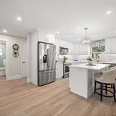 Inside, natural light fills the open layout, creating an easy flow between the main living areas and the kitchen. The kitchen is both functional and inviting, featuring shaker cabinetry, quartz countertops, and KitchenAid appliances—well suited for daily meals or casual gatherings. Durable luxury vinyl flooring, custom ceiling details, and impact-resistant windows and doors add to the home’s clean, updated feel.