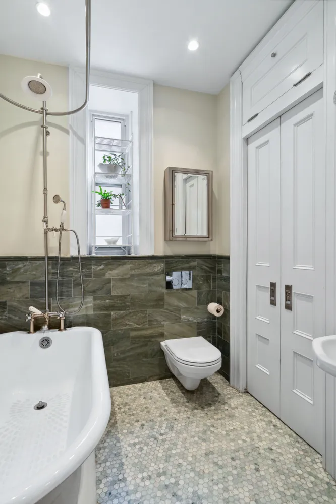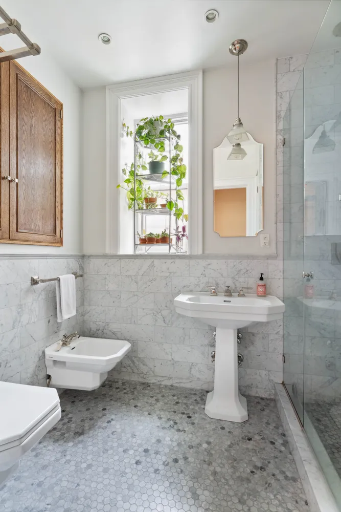 Both full bathrooms are windowed and have been fully renovated with high-end fixtures, recessed lighting and marble tiles.  One of the bathrooms features a luxurious, claw-foot tub and in-unit Washer/Dryer and the other features a glass-enclosed standing shower, pedestal sink and separate bidet.