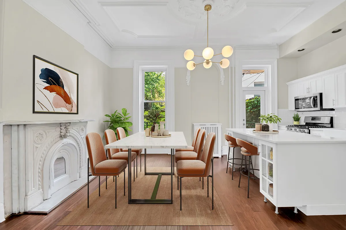 Upon entry, you are greeted by a traditional parlor floor, designed with a graceful flow that is perfect for entertaining. The grandeur of soaring ceilings and floor-to-ceiling windows bathes the front parlor and a windowed kitchen/dining area in an abundance of natural light. Every detail has been carefully considered in the renovation, preserving the home's original character while introducing modern finishes that elevate the living experience.