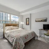 Step into an open-concept living area where high ceilings and dual pane windows enhance the city's skyline views. This unit boasts both carpet and LVP floors, providing a versatile space that caters to comfort and style. Enjoy the convenience of a granite kitchen counter, equipped with essential appliances like a dishwasher, microwave, and refrigerator, perfect for the culinary enthusiast.