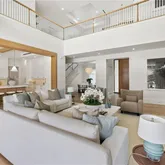 The first floor features two expansive bedrooms, including a luxurious primary suite and a VIP guest suite, along with a large private study. Upstairs, three additional ensuite bedrooms, a second-level living area, and a covered balcony create an ideal retreat for family and guests.