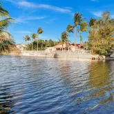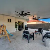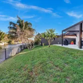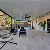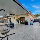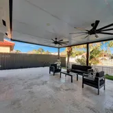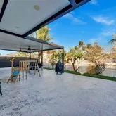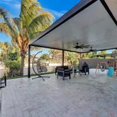 palm tree landscaping. Relax under the insulated aluminum patio roof or retreat to the garage, complete with an
