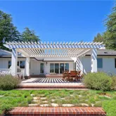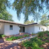 The spacious living room boasts a statement gas fireplace with stone detail, and built-in shelves with accent lighting. The dining room opens directly to the tranquil back patio, complete with built-in BBQ, wooden dining furniture, a trellis, and outdoor speakers - al fresco dining and enjoyment at your fingertips. Lush & consciously curated landscaping and pathways lead to citrus trees and raised garden beds yearning to grow the next crop & currently teeming with ripe cherry tomatoes.