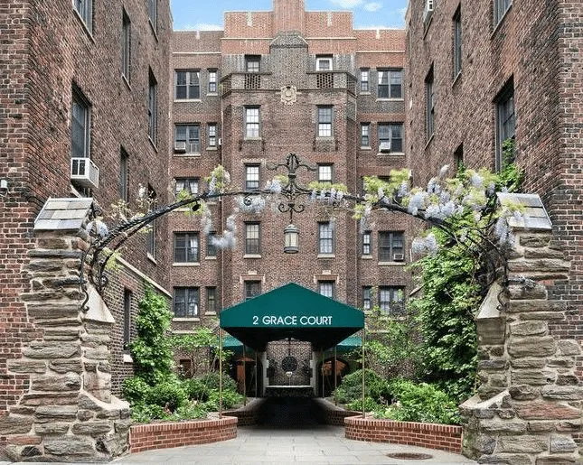 Peacefully set on the cul-de-sac block, 2 Grace Court is a charming 1923 full-service Coop building designed by famed prewar architect Mortimer Freehof and featuring a common roof deck with the best NYC harbor and skyline views imaginable. Residents are warmly greeted by the elegant entry and doorman attended lobby before heading to their elevator bay. The building has an intimate feel because there are 4 wings with only 6 apartments per floor.