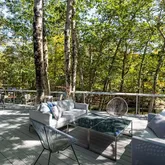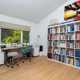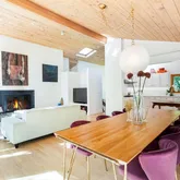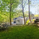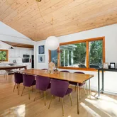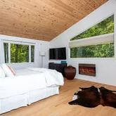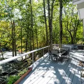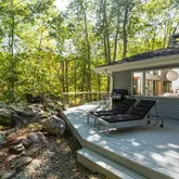 - Public Remarks: Nestled in a serene natural setting, this renovated contemporary features a large deck for indoor/outdoor entertaining and beautiful pond views from most rooms. The bright and sunny interior is filled with natural light from the oversized windows and sliders. The main level has an open floorplan with wood-clad vaulted ceiling, family room/dining room with fireplace and doors opening to the deck, eat-in kitchen, living room with fireplace, primary bedroom and renovated bath, and office with renovated ensuite bath that can also be used as a 5th bedroom. The lower level has 3 bedrooms, 2 renovated baths, a playroom and laundry. Just minutes from restaurants, stores, and the train.