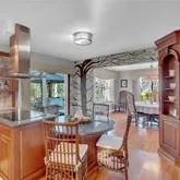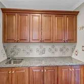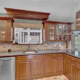 - Room Description: Cherry cabinetry, GE cooktop, Two wall ovens, Stainless steel refrigerator, Frigidaire dishwasher, Wine cooler, Wet bar / Butler’s pantry, Extensive storage, Sliding glass doors: One leading to patio/bar area, One leading to round table area, Powder room off Butler’s pantry with exterior access