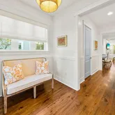 The primary suite on the main level features tray ceilings and a spa-like bath with a freestanding soaking tub, walk-in shower, dual vanities, and ample storage. The first floor also includes a renovated laundry room with butcher block counters, a wine refrigerator, and abundant cabinetry, along with a "sand room" just off the garage, complete with large cabinets and cubbies for storage, designed for easy beach living.