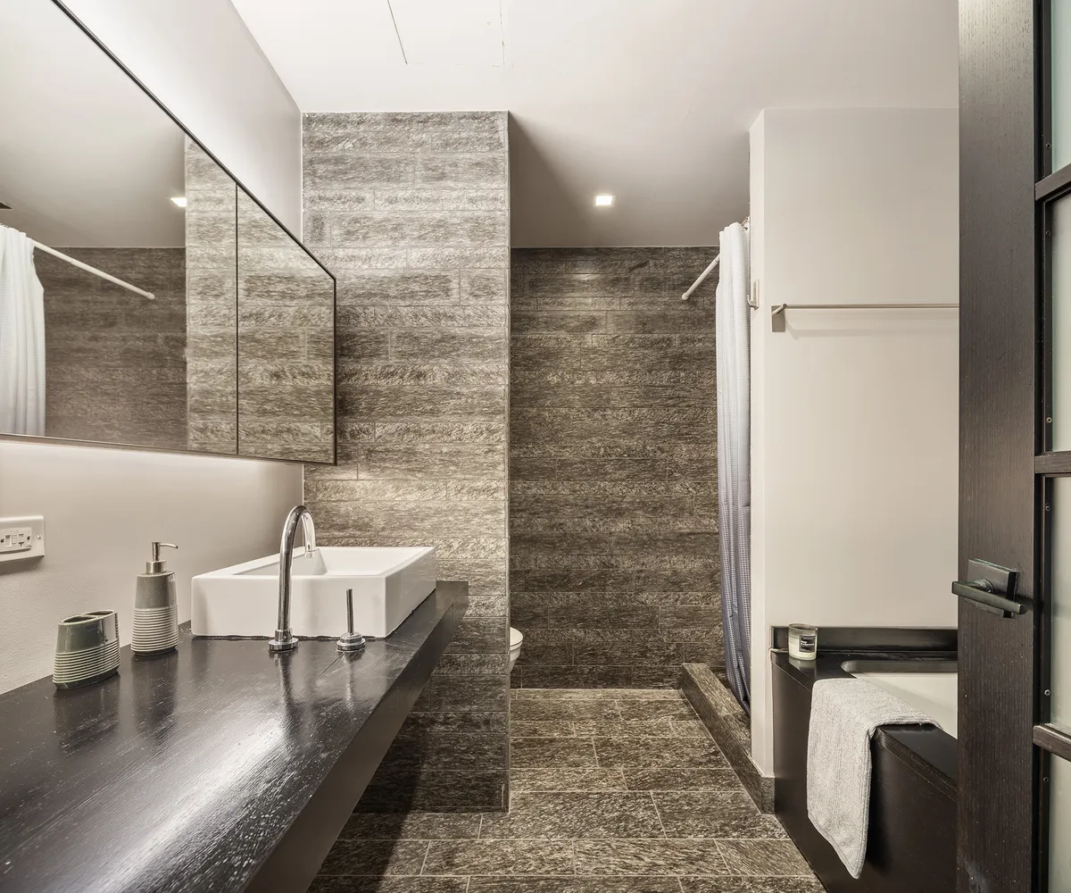 The primary bath off the entry foyer dons Armani Casa-designed premium finishes and separate shower.
