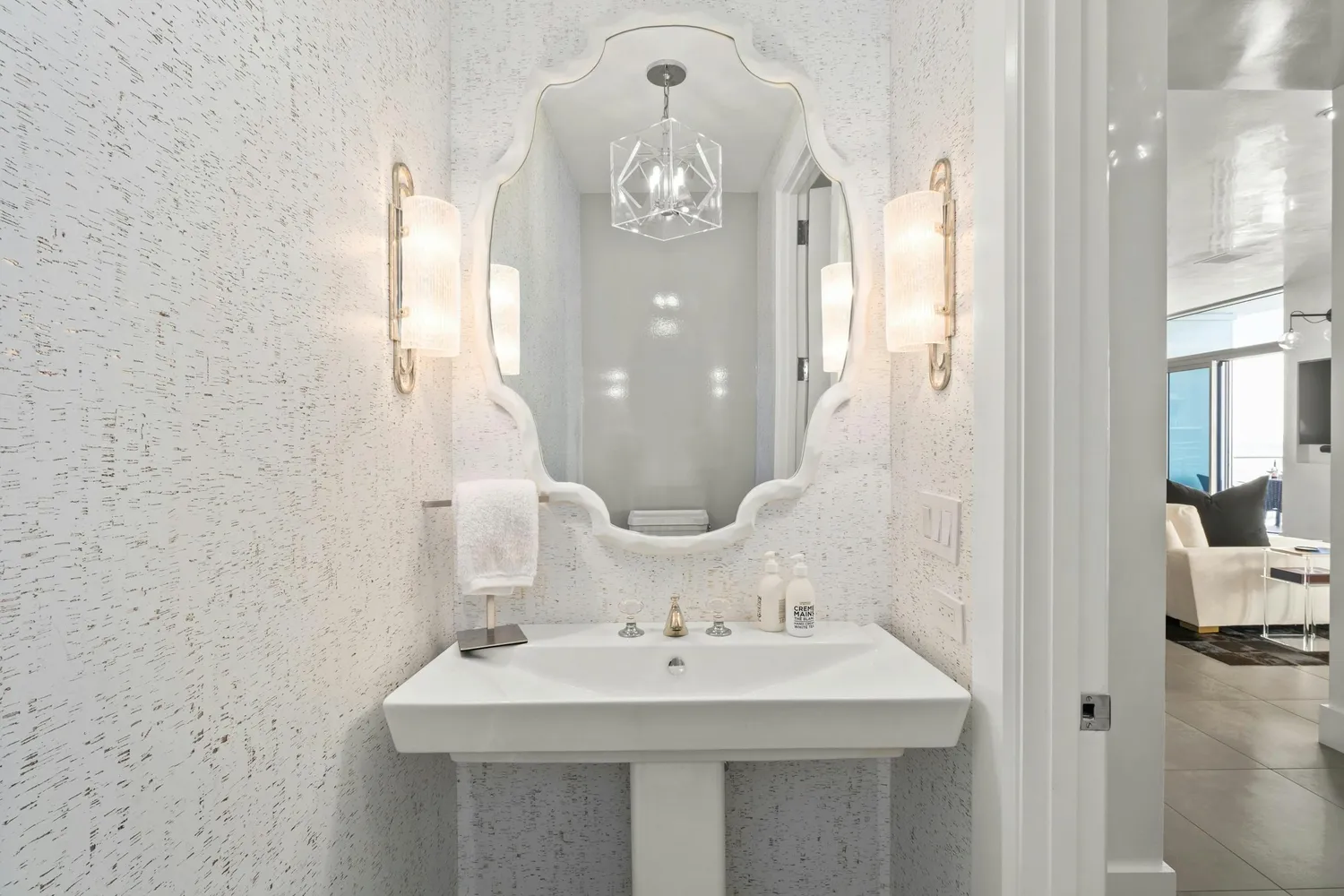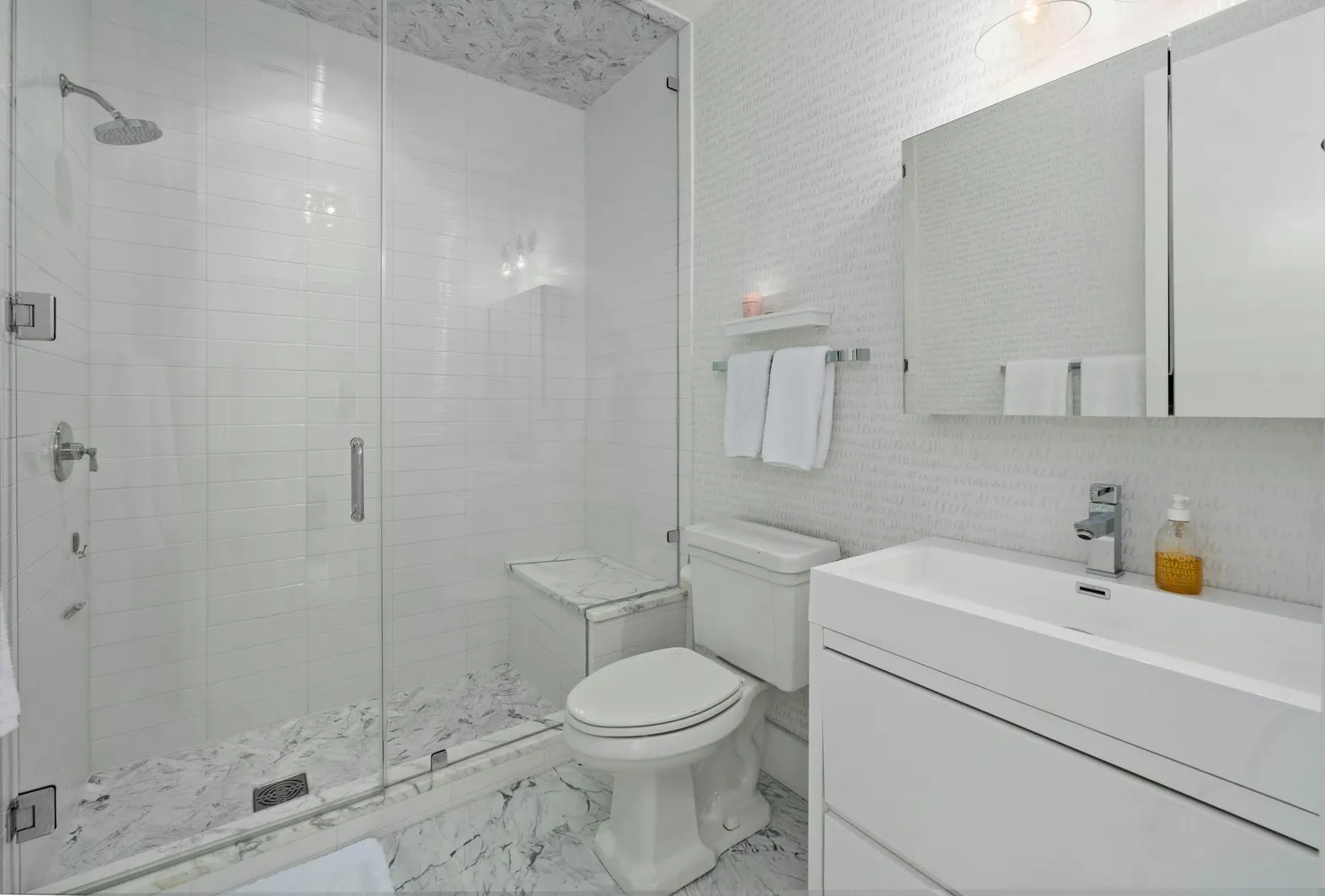 The primary suite is a haven of tranquility, offering panoramic views of the city skyline. Its spa-inspired bathroom is a sanctuary, featuring dual vanities with marble countertops, a soaking tub, elegant marble tile, a glass-enclosed shower, a private water closet and a generous custom closet. The thoughtfully designed guest bedroom features ample space and the use of a unique custom lofted bunk (a queen on bottom and twin on top), a walk-in closet, and an ensuite bathroom with a walk-in shower. Additional conveniences include a powder room for guests and an in-unit laundry room. Two parking spots on a desirable floor convey with this property as well as a 40ft storage closet.