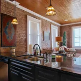 - Interior Features: Beamed Ceilings, Crown Molding, Eat-in Kitchen, Granite Counters, High Ceilings, Kitchen Island, Natural Woodwork, Open Floorplan, Recessed Lighting, Tile Counters