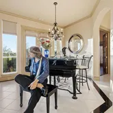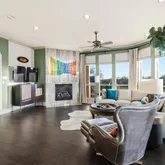 Downstairs features an open-concept floor plan perfect for entertaining, where sweeping golf course views create a stunning backdrop. For added comfort, electric shades allow you to transform the space into a cozy retreat at the touch of a button. Additionally, the study offers a warm, intimate space complete with rich wood flooring, a gas fireplace, built-in shelving, and direct access to the back patio.