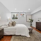 Downstairs, you’ll find two additional wood-floored bedrooms, a laundry room, and a full bath adorned with floor-to-ceiling ceramic tile and a shower with a jacuzzi tub. Thoughtfully placed recessed lighting brightens every corner, while natural sunlight streams in through the sizable windows keeping the lower level feeling airy and inviting.