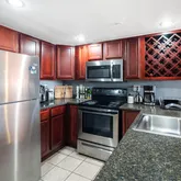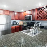 Modern kitchen with granite, stainless steel appliances & wine rack