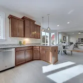 Through the dining room is the kitchen featuring stone counters, natural wood cabinets, stainless appliances, pantry and