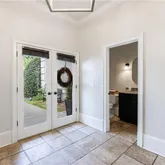A thoughtfully designed rear foyer provides access to the four-car garage, a spacious mudroom, a casual powder room, and a laundry room with a utility sink. This area also offers easy access to the backyard for convenient poolside entertaining.