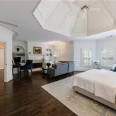 The upper-level primary suite is a true retreat, featuring a sitting area with a cozy fireplace, a wall of windows, and an updated spa-like bath with a stand-alone soaking tub. The suite includes a massive flex space room, two independent walk-in closets, and a third walk-in closet complete with a built-in desk.