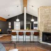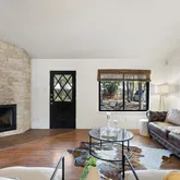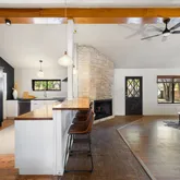 - Room Description: The living room sits under beamed and vaulted ceilings and showcases a striking stone fireplace; Open to the kitchen for seamless connectivity