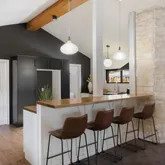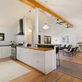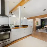 - Room Description: Stylish contemporary chef inspired kitchen butcher block countertops, custom cabinetry, and stainless steel appliances including a dishwasher and gar range with a chef's vent hood; The peninsula is lined with bar seating for four