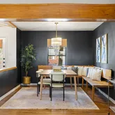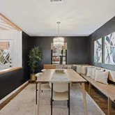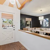 - Room Description: The formal dining room stretches of the kitchen offering an elegant atmosphere for both casual dining and dinner parties with built-in bench seating wrapping around the corner; The entryway is framed in thick wood beams adding to the allure while the half side wall is open to the front door hallway