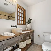 - Room Description: Primary ensuite bath with a unique rustic-vintage inspired vanity, raised bowl sink, and a walk-in shower with tile surround