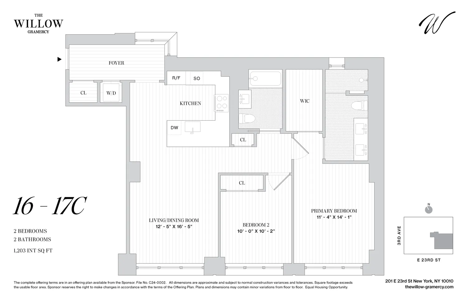 Coming to Gramercy 2026. Residence 17C is a charming two-bedroom, two bathroom home. With expansive south-facing windows, the apartment is filled with natural light, highlighting the elegance of the wide-plank oak flooring throughout. A private windowed foyer leads into the thoughtfully designed space, featuring an open concept kitchen, living, and dining area. The kitchen, beautiful and carefully designed, is open to the living area but set back to maintain separation. The primary bedroom suite...Coming to Gramercy 2026. Residence 17C is a charming two-bedroom, two bathroom home. With expansive south-facing windows, the apartment is filled with natural light, highlighting the elegance of the wide-plank oak flooring throughout. A private windowed foyer leads into the thoughtfully designed space, featuring an open concept kitchen, living, and dining area. The kitchen, beautiful and carefully designed, is open to the living area but set back to maintain separation. The primary bedroom suite feels private and luxurious with generous closet space and a double vanity in the windowed bathroom. A full size washer and dryer complete this special two bedroom home.
