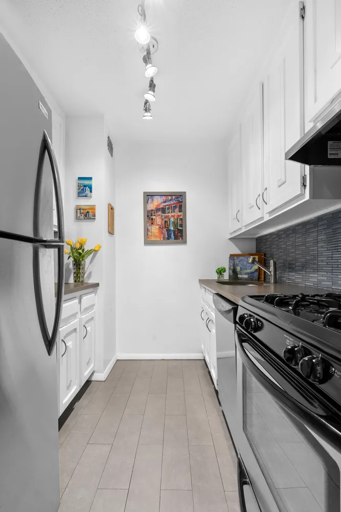Upon entering, you are greeted with a massive living room which provides plenty of space as a comfortable haven for everyday living as well as entertaining and separate dedicated dining area which can accommodate a table and seating for six. There is room for a home office setup as well and no shortage of closet space with three giant custom built entryway closets for storage enthusiasts. Flanked with a wall of extra large east facing windows, enjoy outstanding sunlight and picturesque streetscape views from this room. The living room also provides access to your incredible outdoor space which serves as the perfect retreat for dining al fresco, light gardening, enjoying wine with friends or cozying up with a book. The chic tucked away kitchen is outfitted with stainless steel appliances, a gas stove/oven, plenty of white shaker style cabinetry, dishwasher, stylish stone countertops and trendy backsplash.