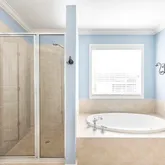 - Interior: Bookcases, Double Vanity, High Ceilings, Pulldown Attic Stairs, Separate Shower, Soaking Tub, Tile Bath, Tray Ceiling(s), Two Story Foyer, Walk-In Closet(s)