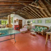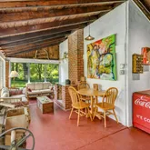- Room Description: SUMMER HOUSE: painted concrete floor; vaulted wood ceiling; pendant light; floor-to-ceiling brick woodburning fireplace