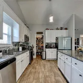 - Kitchen Features: Breakfast Bar, Breakfast Room, Cabinets White, Kitchen Island, Pantry, Pantry Walk-In, Stone Counters, View to Family Room
