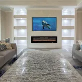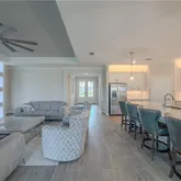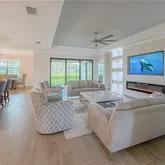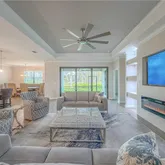 As you arrive, you're greeted by elegant custom double glass entry doors and tongue-and-groove wood ceilings at both the front entry and lanai, setting the tone for the quality found within. Inside, crown molding enhances every room, while the open-concept living area features a stunning built-in entertainment center complete with a fireplace, mounted TV, and feature lighting — creating a warm and inviting space for relaxing or entertaining.