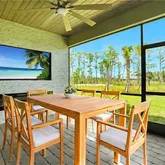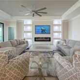 Outdoor living is equally impressive. The expansive lanai is outfitted with a second entertainment center including a fireplace and TV, perfect for year-round enjoyment. The tongue-and-groove ceiling continues here, and the home’s east-facing rear exposure offers tranquil views of tall trees and a peaceful preserve.