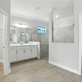 Additional highlights include upgraded bathrooms with frameless glass shower doors, custom mirrors, designer lighting and ceiling fans in every room, and a fully outfitted laundry room with cabinets and shelving. A mirror feature wall in the front entry adds a sophisticated touch, while the three-car garage features durable epoxy flooring for a clean, polished look.