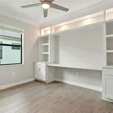 The kitchen is a true showpiece, offering under- and over-cabinet lighting, a custom backsplash, designer tile with accent lighting beneath the island, and top-quality finishes. The adjacent den has been transformed into a fully custom-built office with cabinetry, shelving, and integrated lighting, making it ideal for remote work or study.