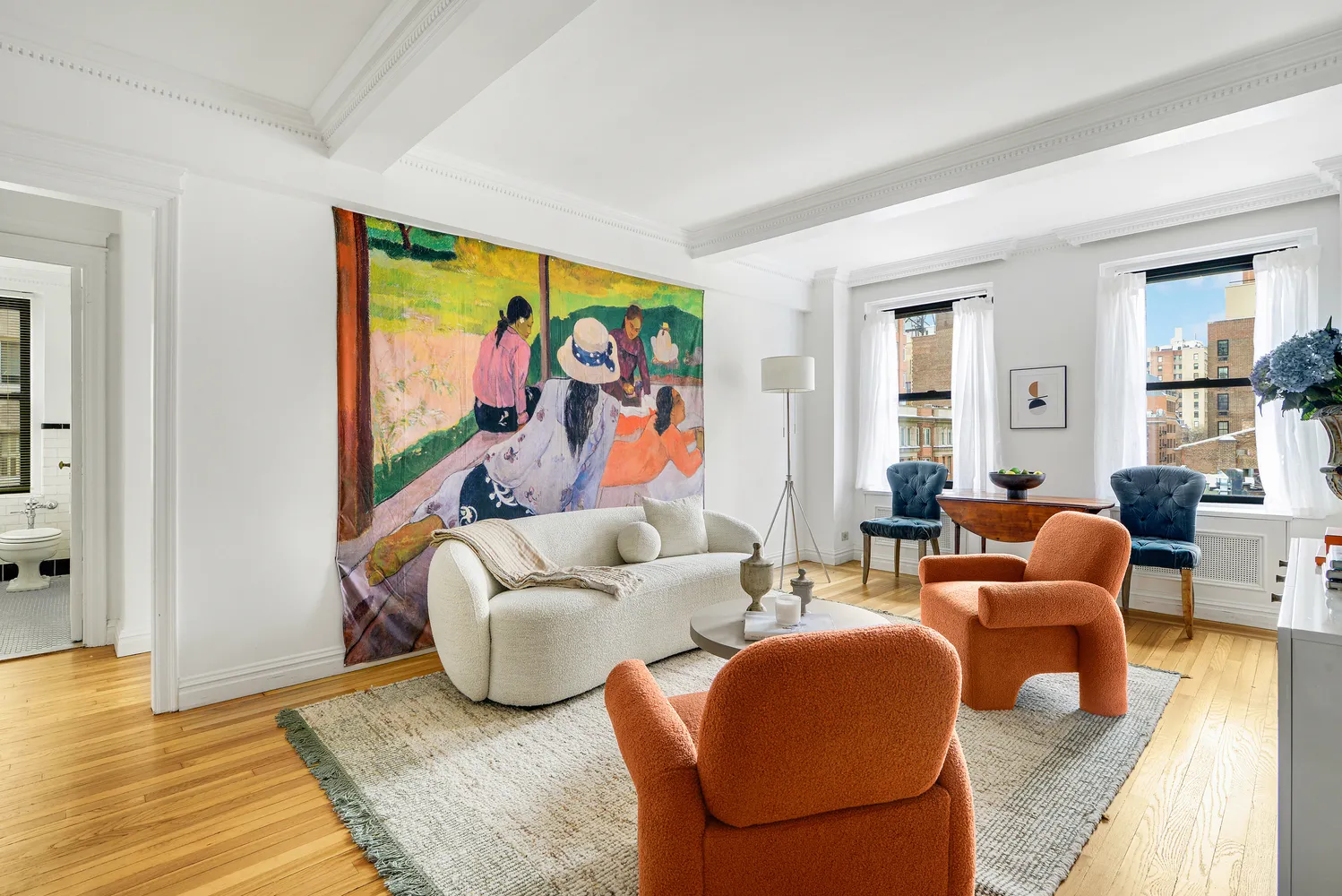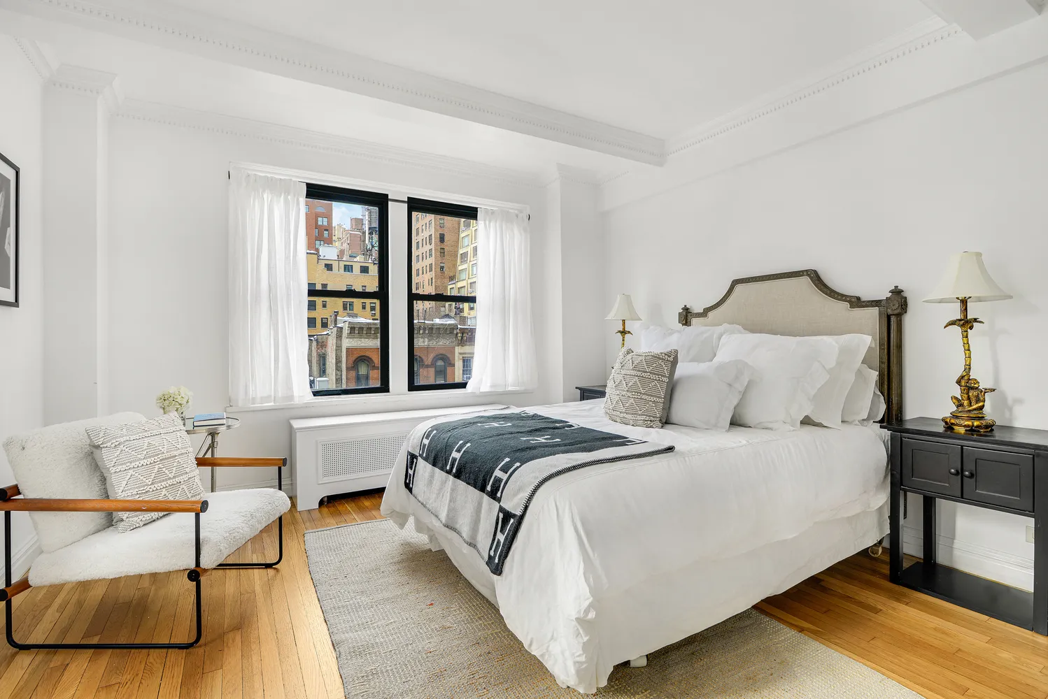 The expansive living room is flooded with bright sunlight, creating an ideal setting for both everyday living and entertaining. Large windows enhance the openness and highlight the apartment’s gracious scale. The corner bedroom, wrapped in windows, enjoys abundant light from multiple exposures, offering a serene and sun-drenched retreat.