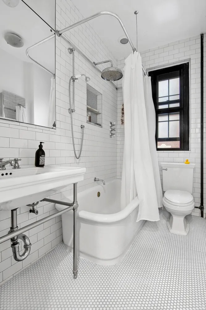 Throughout the home, original parquet floors have been newly refinished, and classic wall moldings maintain the apartment’s timeless character. Carefully curated updates include modern ceiling fans, designer light fixtures, and a fully renovated kitchen and bathroom. The kitchen offers a clean, contemporary aesthetic with updated appliances, while the bathroom is a stylish blend of vintage and modern, featuring sleek finishes and the original soaking tub — a charming nod to the building’s storied past.