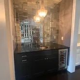 The interior is bathed in light from oversized windows. The dramatic 2-story foyer with honed marble flooring and raised paneled wainscoting provide a breathtaking entry to this awe-inspiring home. After your jaw drops as you look through the double archways off of the foyer into the formal Living Room with a cast stone gas fireplace and coffered ceiling, you can turn left and walk through an elegant Dining Room with trey ceiling, fabulous glass chandelier and adjacent Butler’s Pantry with beveled mirrored backsplash, sink and wine fridge or go straight through the beautiful hallway with barrel ceiling. Either way you will be delighted when you arrive in the Kitchen, which is the heart of the home.
