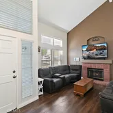 bedroom. Inside, the layout is open and inviting with vaulted ceilings in the family room