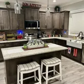 Large kitchen with granite countertops, farm sink, granite island with seating, and Instaview