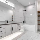 - Interior Features: Breakfast Bar, Butlers Pantry, Double Vanity, High Ceilings, Kitchen Island, Kitchen Family Room Combo, Bath In Primary Bedroom, Pot Filler, Self Closing Cabinet Doors, Self Closing Drawers, Soaking Tub, Separate Shower, Tub Shower, Walk In Pantry, Ceiling Fans, Programmable Thermostat