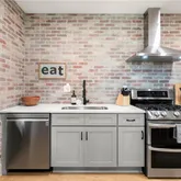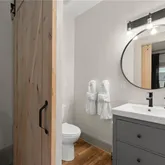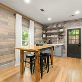Inside, the vibe is equal parts modern and warm. The open living space flows into a fully renovated kitchen and dining area featuring quartz countertops, soft-close cabinetry, stainless steel appliances, custom shelving, and eye-catching brick and wood accents that give the home real personality. The primary suite delivers with a newly added ensuite bath, complete with subway tile and a stylish barn door.