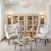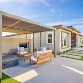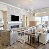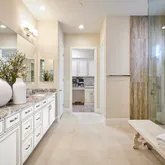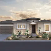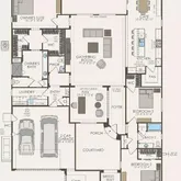 glass walk-in shower in Owner's Bath, guest rooms with en suite baths. Please note photos are of the model home. Floorplan rendering with furniture is for representation only and not included with purchase.This is the Voyage Plan in the Encore Series at Del Webb Rancho Mirage. Offering an open-corner slider in Gathering room, interior fireplace, upgraded quartz countertops in kitchen,