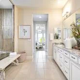 glass walk-in shower in Owner's Bath, guest rooms with en suite baths. Please note photos are of the model home. Floorplan rendering with furniture is for representation only and not included with purchase.