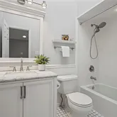 The second floor offers a spacious primary suite with spectacular water views, oversized windows, a Juliette balcony, generous closet space, and a fully renovated ensuite bathroom featuring a walk-in shower and elegant marble tile flooring. The second bedroom is equally bright and roomy, with two large closets and oversized windows. A beautifully updated hall bath with skylight serves the second bedroom, along with a separate laundry area featuring in-unit washer/dryer, linen closet, and utility closet for added convenience. Custom finishes throughout include crown molding, 3/4 inch solid oak floors and premium Graber window treatments. This home offers modern convenience with central air, forced heat and in -unit laundry, tandem garage parking space, which includes a 120V 20 amp outlet that has been permitted for a class 1 EV charger, and a storage shed.