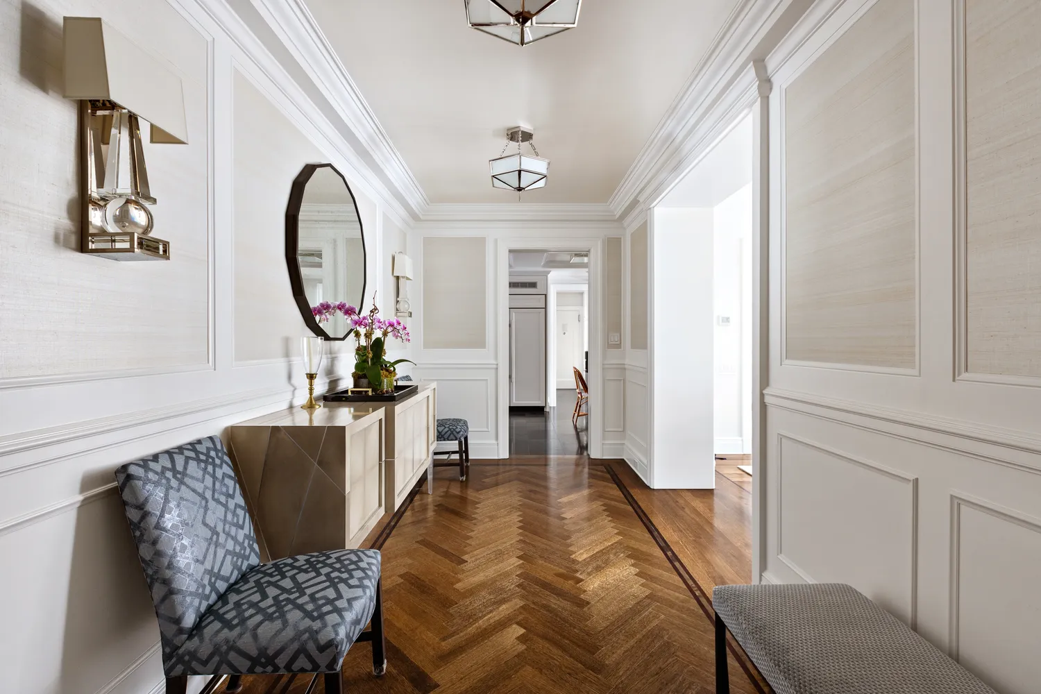 The private bedroom wing includes three generously sized bedrooms, including a serene and exquisite primary suite with a windowed marble en-suite bath featuring a shower, and a walk-in closet.
