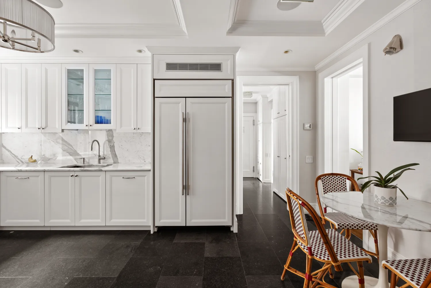 At the heart of the home is the oversized chef’s kitchen, thoughtfully designed with marble countertops, custom cabinetry, high-end appliances, and a relaxed eat-in area. Just beyond the kitchen is a home office with built-in millwork, a washer and dryer, and a full en-suite bath. It can also serve as a cozy fourth bedroom.