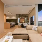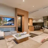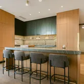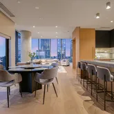 The spa-inspired primary bathroom has been fully renovated with a floating wet deck, freestanding soaking tub, and LED-lit medicine...Experience luxury living at The W Residences in this beautifully renovated condo at 210 Lavaca. Showcasing breathtaking Lake Austin and city views, this residence features high-end upgrades throughout, including 13 slabs of Pietra Grey marble, custom kitchen cabinetry, custom steel doors, recent flooring, LED lighting, and a redesigned fireplace with built-in media unit.