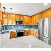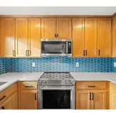 - Kitchen Appliances: Builtin Range, Convection Oven, Cooktop, Dishwasher, Disposal, Free Standing Refrigerator, Island, Microwave, Plumbed For Ice Maker, Quartz, Stainless Steel Appliance, Tile
