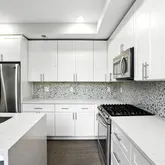 A sleek, open-concept kitchen featuring Italian White Carrara Quartz countertops, European glass mosaic backsplash, and premium appliances