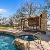 The home opens to an inviting outdoor living area featuring a screened-in porch overlooking the backyard. A pool and spa, outdoor grill area, outdoor fireplace, and fire pit create the perfect setting for gatherings, weekend relaxation, and enjoying time outdoors.